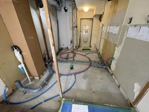 既存衛生器具・床組、間仕切り壁等の造作を撤去し、給排水管更新いたしました。